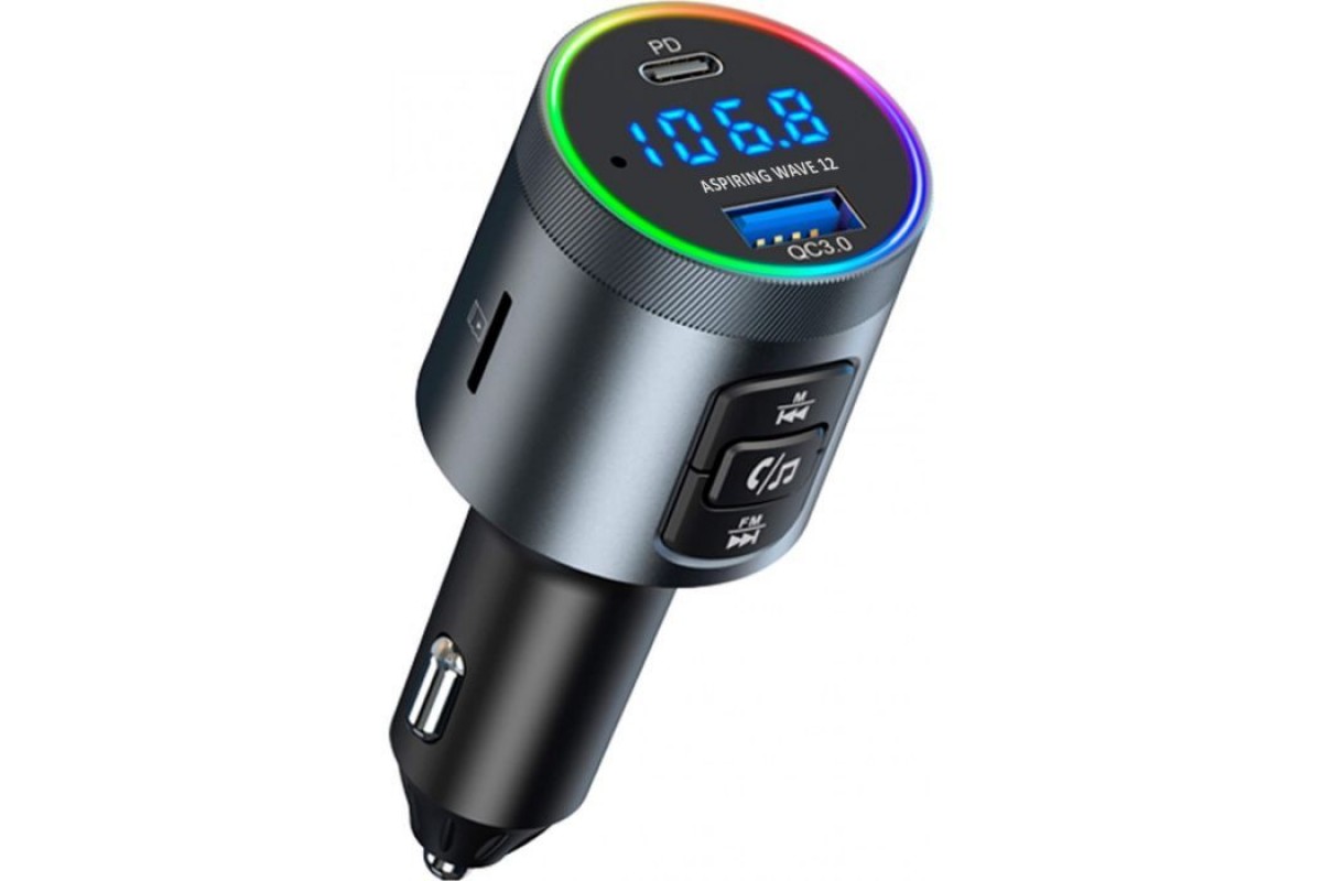 FM-трансмітер Aspiring Wave 12 виконано в класичному стилі та оснащено портами для швидкої зарядки: QC 3.0 (18W) та Type-C PD (30W), що дозволяє одночасно заряджати два пристрої з максимальною ефективністю.