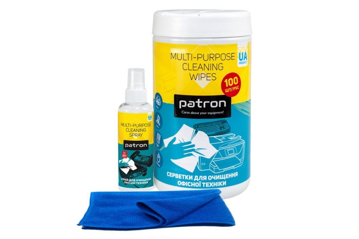 Комплект 3в1: серветки для очищення оргтехніки, туба 100 шт (F3-028) + очисник оргтехніки та пластику спрей, 100 мл (F3-009) + серветка мікрофібра 30×30 см (F4-009) Patron