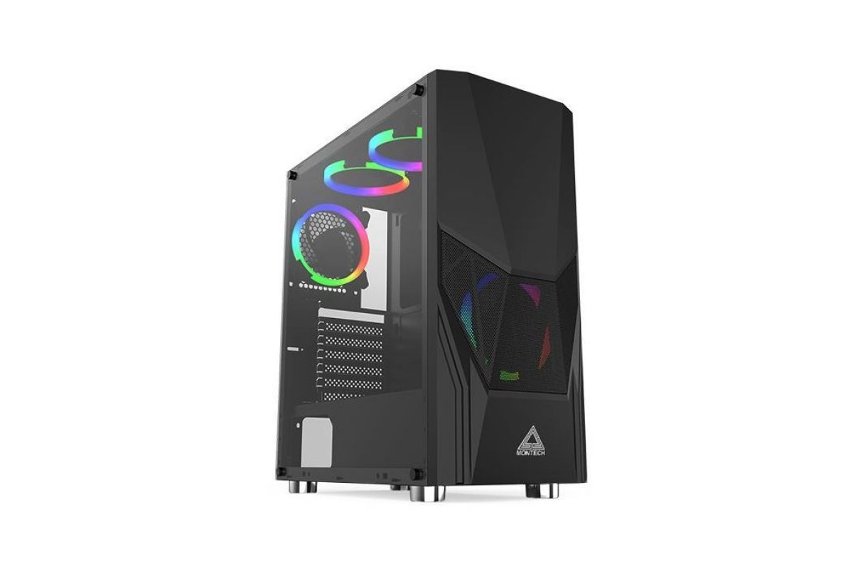 Головною відмінною рисою Montech Fighter 500 є його бічна панель із загартованого скла, що має елегантний логотип "M". Це додає особливого шарму й дозволяє насолоджуватися внутрішнім вмістом корпусу без зусиль. Вбудовані чотири вентилятори Rainbow LED розміром 120 мм не лише забезпечують ефективне охолодження, але й створюють захоплюючий світловий ефект, що підкреслює унікальний стиль вашого ПК.
