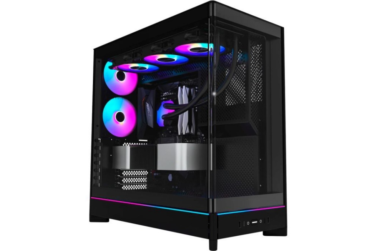Особлива увага приділена системі охолодження. Корпус оснащений п'ятьма попередньо встановленими вентиляторами GF120 V2 ARGB, які не тільки забезпечують ефективне охолодження, але й додають кольорових акцентів завдяки інтегрованому підсвічуванню. Додаткові місця для вентиляторів на верхній панелі (3x12 см) та підтримка радіаторів рідинного охолодження (Back 120 мм, Top 360/240/120 мм, Bottom 120/240 мм) забезпечують підтримку стабільної температури навіть під найвищими навантаженнями, що є важливою перевагою для сучасних ігор та ресурсомістких додатків.