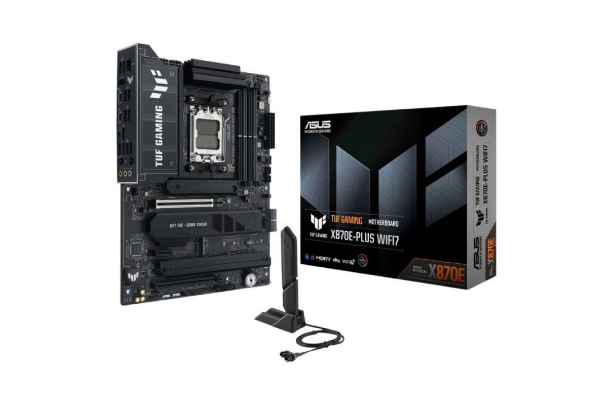 Материнська плата ASUS TUF GAMING X870E-PLUS WIFI7 — це безкомпромісне рішення для геймерів та ентузіастів, яке поєднує в собі високу якість і широкі можливості підключення. Завдяки новітньому чіпсету AMD X870E, ця плата не лише підтримує сучасну архітектуру, але й відкриває світ нових технологій, пропонуючи вам інструменти для створення потужної системи, яка бездоганно впорається з вимогами найінтенсивніших ігор.