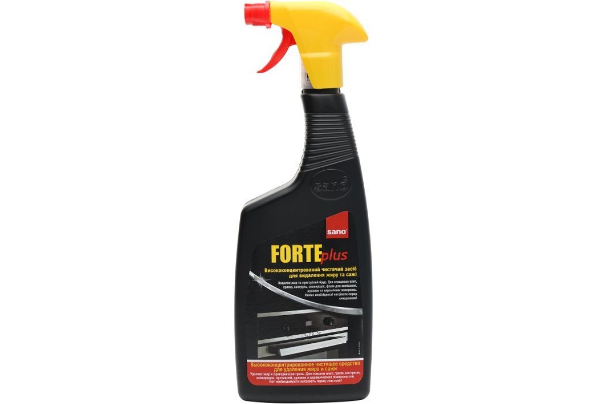 Sano Forte Plus — концентрований високоефективний засіб для видалення жиру, сажі та кіптяви. З легкістю видаляє найважчий бруд, що глибоко в'ївся, і обгорілий жир із духовок, дек, гриля, каструль, казанів, сковорідок, решіток, витяжок, кухонних робочих поверхонь та інше.